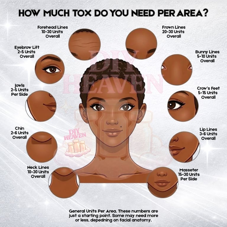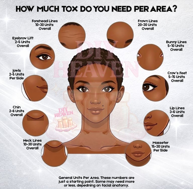 One thing you’ll notice if you Google tox charts is that the numbers are often a little different on every diagram. That’s normal. There isn’t one exact number that fits everyone. Dosing can vary depending on anatomy, muscle strength, goals, and whether it’s your first treatment or a touch up.