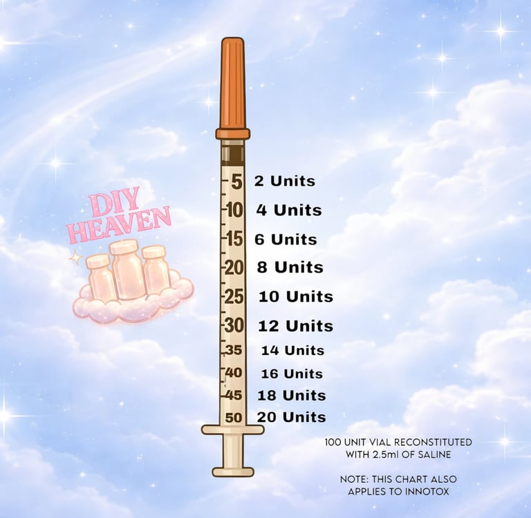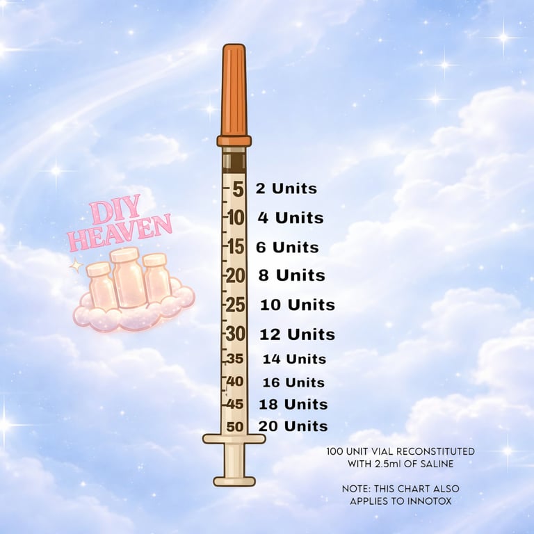This tox unit syringe chart applies to all reconstituted toxins, including Innotox (which is already pre-mixed). It’s designed to help you stay organized and confident when preparing for treatment.